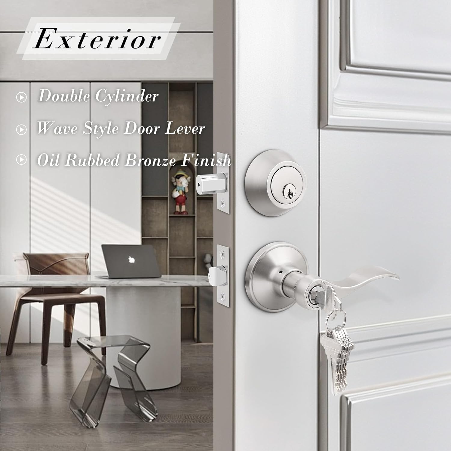 Introducing our single-keyed entry door handle set, designed for simplicity and protection. With a keyed-like system, you can operate both the wave-style lever handle and the single-cylinder deadbolt using the same key. This is ideal for homes with multiple doors, offering both convenience and a secure locking solution.